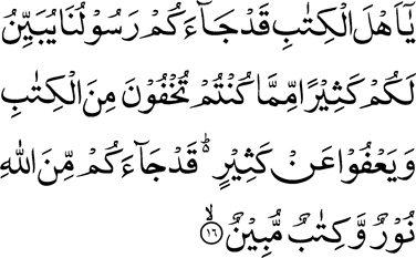 Translation (alislam.org) [5:16] O People of the Book! there has come to you Our Messenger who unfolds to you much of what you had kept hidden of the Book and passes over much. There has come to you indeed from Allah a Light and a clear Book. اے اہلِ کتاب! یقیناً تمہارے پاس ہمارا وہ رسول آچکا ہے جو تمہارے سامنے بہت سی باتیں جو تم (اپنی) کتاب میں سے چُھپایا کرتے تھے خوب کھول کر بیان کررہا ہے اور بہت سی ایسی ہیں جن سے وہ صرفِ نظر کر رہا ہے۔ یقیناً تمہارے پاس اللہ کی طرف سے ایک نور آچکا ہے اور ایک روشن کتاب بھی۔ |