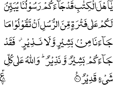 Translation (alislam.org) [5:20] O People of the Book! there has come to you Our Messenger, after a break in the series of Messengers, who makes things clear to you lest you say, ‘There has come to us no bearer of glad tidings and no warner.’ So a bearer of glad tidings and a warner has indeed come to you. And Allah has power to do all things. اے اہلِ کتاب! رسولوں کے ایک لمبے انقطاع کے بعد تمہارے پاس یقیناً ہمارا وہ رسول آچکا ہے جو تمہارے سامنے (اہم امور) کھول کر بیان کر رہا ہے مبادا تم یہ کہو کہ ہمارے پاس نہ کوئی بشیر آیا اور نہ کوئی نذیر۔ پس یقیناً تمہارے پاس بشیر اور نذیر آچکا ہے۔ اور اللہ ہر چیز پر جسے وہ چاہے دائمی قدرت رکھتا ہے |