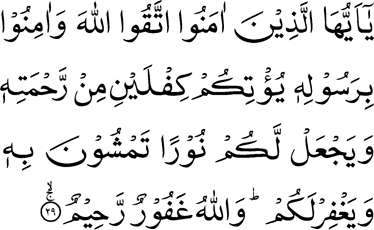 Translation (alislam.org) [57:29] O ye who believe! fear Allah and believe in His Messenger; He will give you a double share of His mercy, and will provide for you a light wherein you will walk, and will grant you forgiveness — and verily Allah is Most Forgiving, Merciful — اے لوگو جو ایمان لائے ہو! اللہ کا تقویٰ اختیار کرو اور اس کے رسول پر ایمان لاؤ وہ تمہیں اپنی رحمت میں سے دُہرا حصہ دے گا اور تمہیں ایک نور عطا کرے گا جس کے ساتھ تم چلو گے اور تمہیں بخش دے گا اور اللہ بہت بخشنے والا (اور) بار بار رحم کرنے والا ہے۔ |