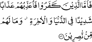Translation (alislam.org) [3:57]‘Then as for those who disbelieve, I will punish them with a severe punishment in this world and in the next, and they shall have no helpers.We never punish until We have sent a Messenger. پس جہانتک ان لوگوں کا تعلق ہے جنہوں نے کفر کیا تو اُن کو میں اِس دنیا میں بھی اور آخرت میں بھی شدید عذاب دوں گا اور ان کے کوئی مددگار نہیں ہوں گے۔ |