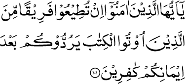 Translation (alislam.org) [3:101] O ye who believe! if you obey any party of those who have been given the Book, they will turn you again into disbelievers after you have believed. اے وہ لوگو جو ایمان لائے ہو! اگر تم نے ان لوگوں میں سے جنہیں کتاب دی گئی، کسی گروہ کی اطاعت کی تو وہ تمہیں تمہارے ایمان لانے کے بعد (ایک دفعہ پھر) کافر بنا دیں گے |