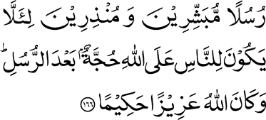 Translation (alislam.org) [4:166] Messengers, bearers of glad tidings and warners, so that people may have no plea against Allah after the coming of the Messengers. And Allah is Mighty, Wise. کئی بشارتیں دینے والے اور انذار کرنے والے رسول (بھیجے) تاکہ لوگوں کے پاس رسولوں کے آنے کے بعد اللہ کے مقابل پر کوئی حجت نہ رہے اور اللہ کامل غلبہ والا (اور) بہت حکمت والا ہے |