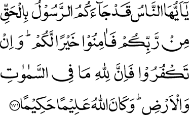 O Mankind, whenever/when/if the messenger of your provider (Allah) reaches you or has reached you, (The word “JA’A-KUM” is about reaching in person and physically) thus accept (believe) him. This is better for you to beleive/accept him. If you refuted him, then surely what ever is in the heavens and what ever is in the earth is for Allah. This is so because Allah has the knowledge and the wisdom.