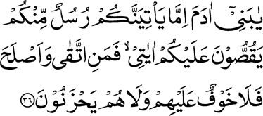 Translation (alislam.org) [7:36] O children of Adam! if Messengers come to you from among yourselves, rehearsing My Signs unto you, then whoso shall fear God and do good deeds, on them shall come no fear nor shall they grieve. اے ابنائے آدم! اگر تمہارے پاس تم میں سے رسول آئیں جو تم پر میری آیات پڑھتے ہوں تو جو بھی تقویٰ اختیار کرے اور اصلاح کرے تو ان لوگوں پر کوئی خوف نہیں ہوگا اور وہ غمگین نہیں ہوں گے۔ |