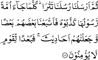 Translation (alislam.org) [23:45] Then We sent Our Messengers one after another. Every time there came to a people their Messenger, they treated him as a liar. So We made them follow one another to destruction and We made them mere tales. Cursed, then, be the people who believe not! پھر ہم نے اپنے رسول پے در پے بھیجے۔ جب بھی کسی امّت کی طرف اس کا رسول آیا تو انہوں نے اسے جھٹلا دیا۔ پس ہم اُن میں سے بعض کو بعض دوسروں کے پیچھے لائے پھر ہم نے اُنہیں قصّے کہانیاں بنا دیا۔ پس لعنت ہو اَیسی قوم پر جو ایمان نہیں لاتے۔ |