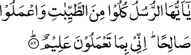 Translation (alislam.org) [23:52] O ye Messengers, eat of the things that are pure, and do good works. Verily, I am well aware of what you do. اے رسولو! پاکیزہ چیزوں میں سے کھایا کرو اور نیک اعمال بجا لاؤ۔ جو کچھ تم کرتے ہو اُس کا میں یقیناً دائماً علم رکھتا ہوں۔ |