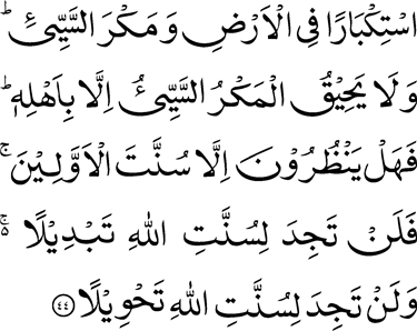 Translation [35:44]Out of arrogance in the earth and evil plotting. But the evil plot encompasses none but the authors thereof. Do they then look for anything but God’s way of dealing with the peoples of old? You will never find any change in the ways of Allah; nor will you ever find any alteration in the ways of Allah. |