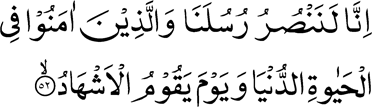 Translation (alislam.org) [40:52] Most surely We help Our Messengers and those who believe, both in the present life and on the day when the witnesses will stand forth, یقیناً ہم اپنے رسولوں کی اور اُن کی جو ایمان لائے اِس دنیا کی زندگی میں بھی مدد کریں گے اور اُس دن بھی جب گواہ کھڑے ہوں گے۔ |